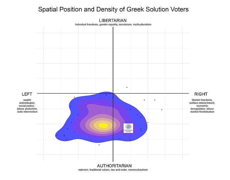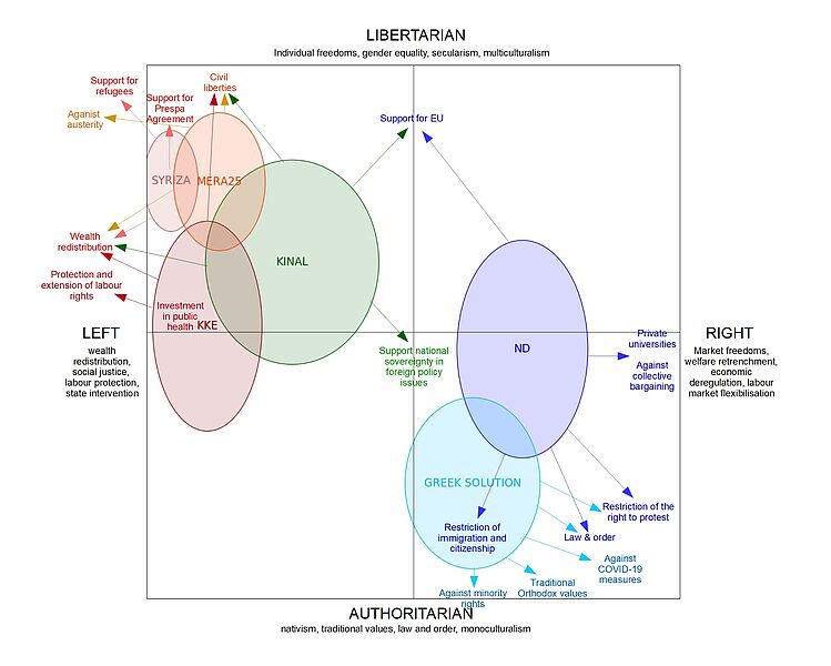 1. There seems to be some degree of polarization along the left-right axis, particularly between conservative ND and the left-of-center parties (SYRIZA, KINAL, KKE, MeRA25). For Greek Solution, economic issues appear to be less salient and its position on the economy is somewhat ambivalent - same as other right-wing populist parties in Europe.